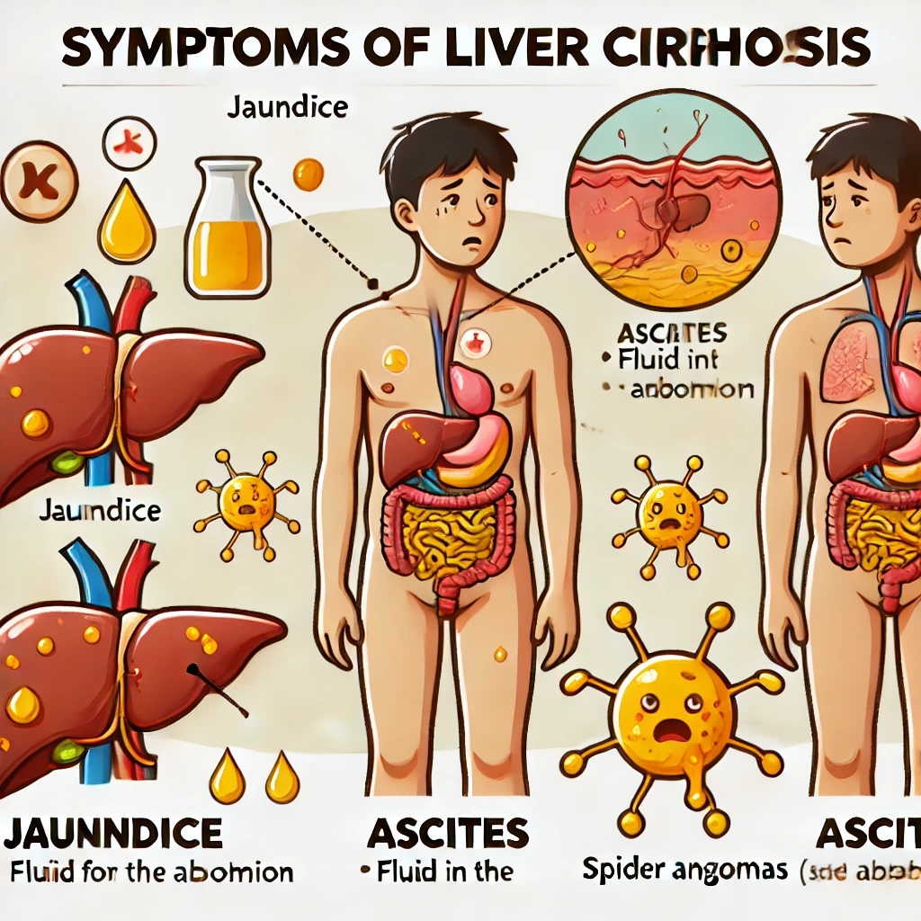 간경화 초기에는 뚜렷한 증상이 없는 경우가 많습니다. 하지만 간이 점점 손상되면서 피로감, 식욕 저하, 복부 불편감 등이 나타날 수 있습니다. 병이 진행되면 복수(배에 물이 차는 현상), 황달(피부와 눈이 노랗게 변하는 증상), 정신 혼란(간성 뇌병증), 그리고 거미상 혈관종(피부에 거미 모양의 붉은 혈관이 나타나는 증상) 등이 발생할 수 있습니다.