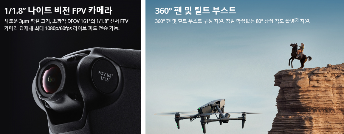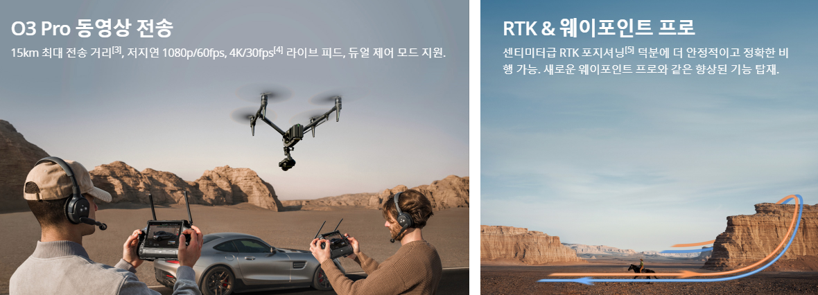 DJI Inspire 시리즈전문가용 드론으로서 8K 동영상 촬영이 가능하며, 360도 팬 및 틸트 부스트 구조를 통해 다양한 각도의 촬영이 가능합니다. 28분의 비행시간센티미터급 RTK 포지셔닝으로 정밀한 비행이 가능합니다.