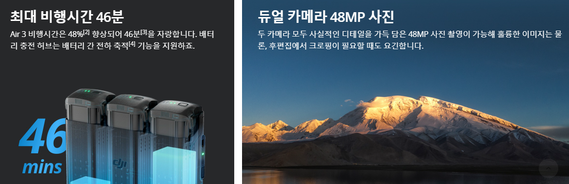 DJI Air 3 ₩1,340,000 46분 광각 & 망원 중급-상급 사용자